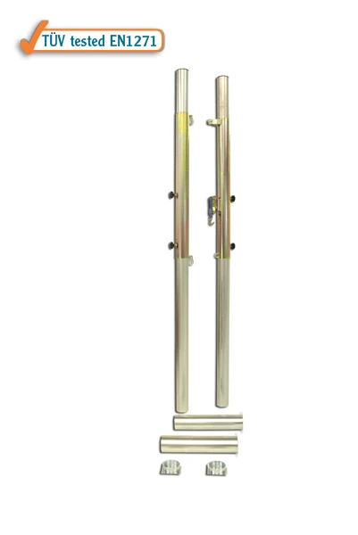 Odbojkaški sustav izrađen od visokokvalitetnog galvaniziranog čelika, koji uključuje dva stupa s postoljima za ugradnju u tlo.